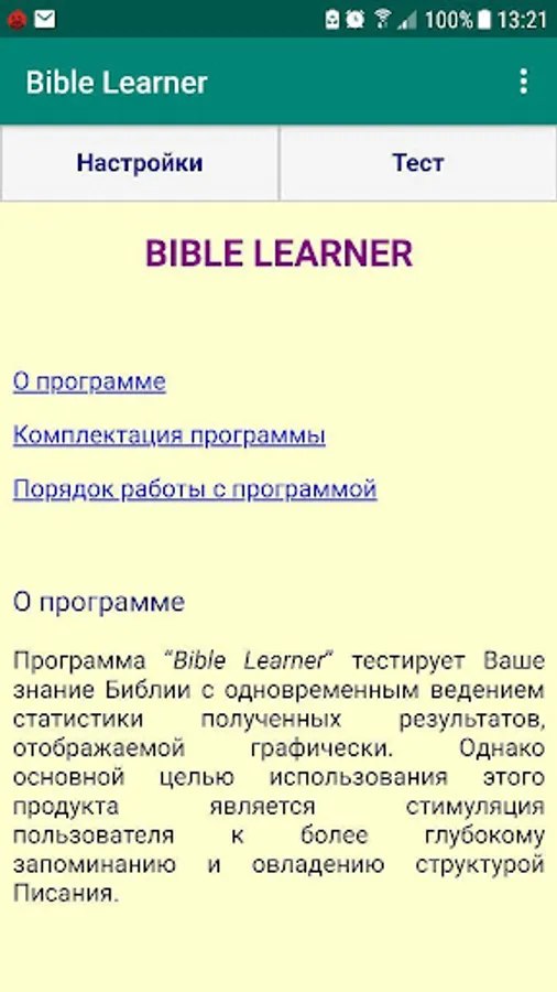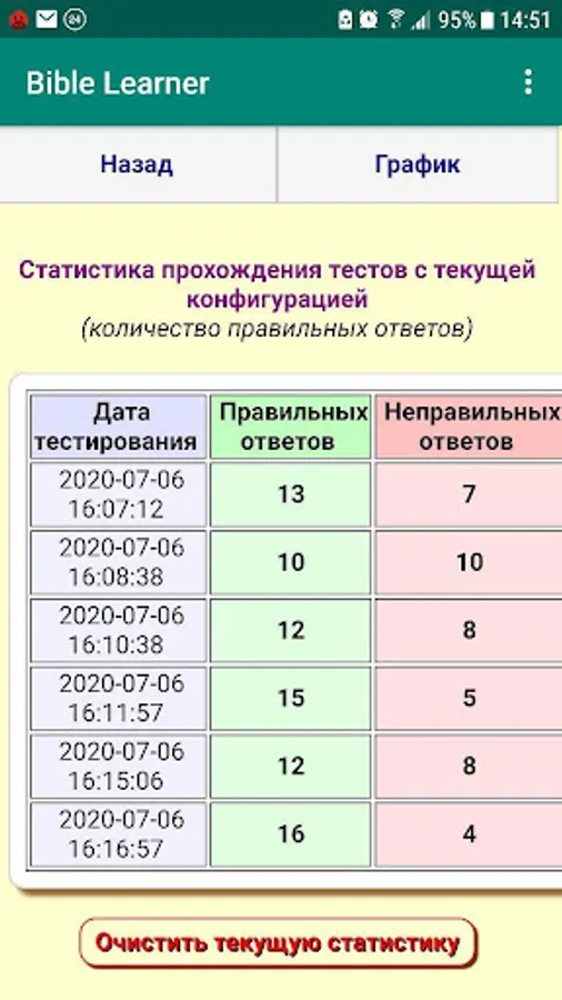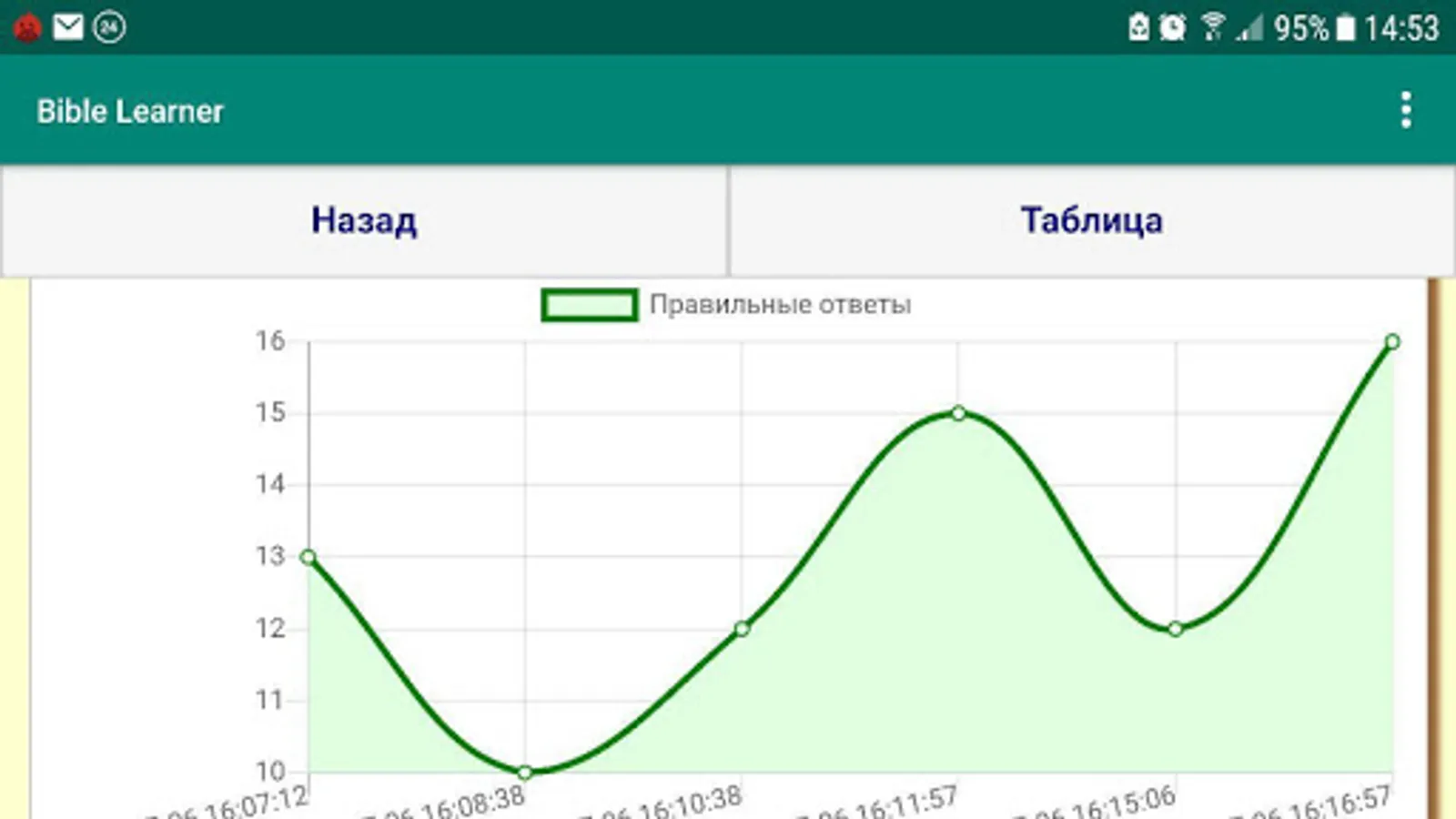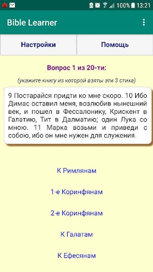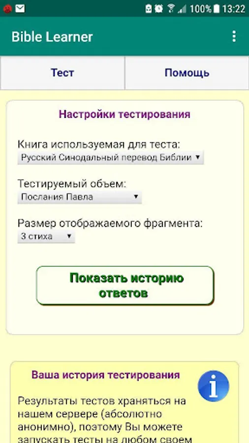 It is necessary to indicate the book of the Bible from which the proposed passage of Scripture is taken. You adjust the size of the fragment (from the whole chapter to the 1st verse) and the volume of books used in the test (the whole Bible, only the New Testament, only the Old Testament, the Epistles of Paul, etc.). After 20 questions, a list of books is displayed in the identification of which you made mistakes with the ability to re-read them here (in the program). Your results are saved and at any time in the future can be viewed both as a list or as a graph, which gives an idea of your progress / regression in studying the Scriptures. The program requires the Internet, since the program practically does not take up space on your device, and all materials are stored on the server.