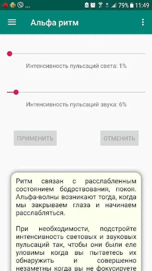 Stimulation of the brain through exposure to visual and auditory receptors from one of the typical brain frequencies (Alpha, Beta, ...). Along with the preset frequencies (Alpha and Beta), it is possible to indicate your own. There is a schedule of stimulations. There is a counter and a stimulation limit per day. There is an automatic launch of the application when the device is restarted. Thanks to all of the above - the application does not require your attention after installation and one-time setup.