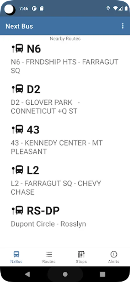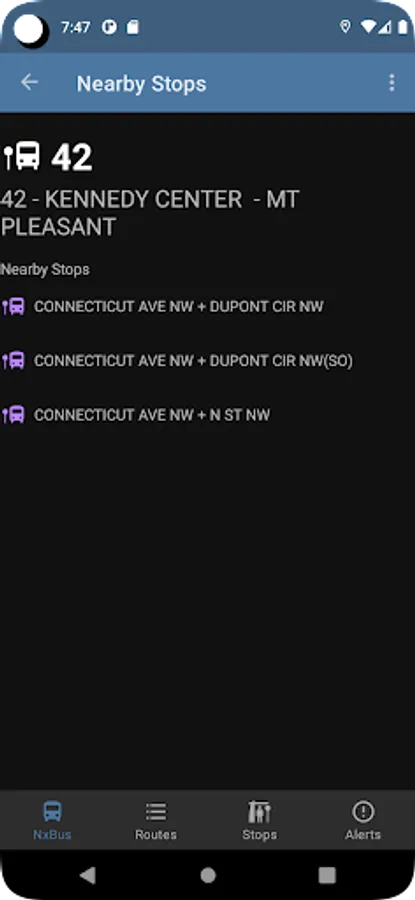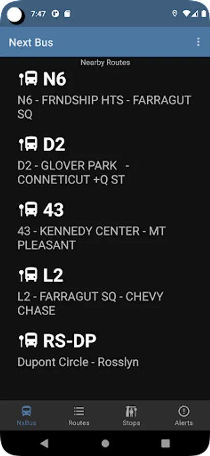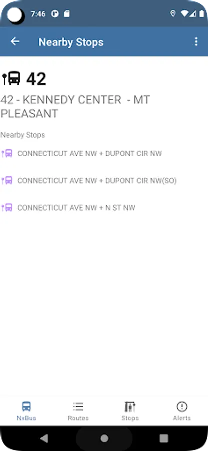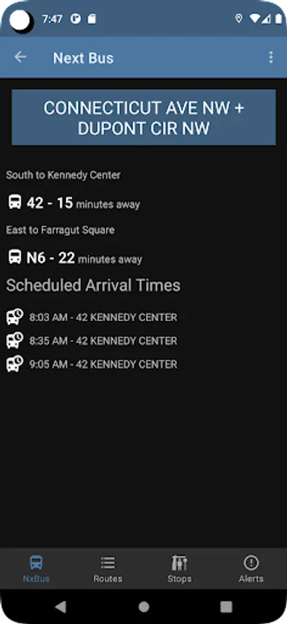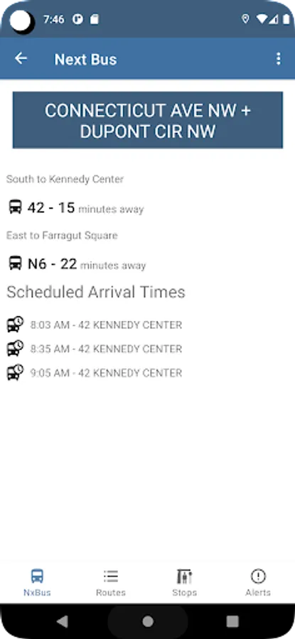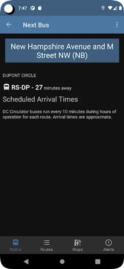 DC NxBus displays next bus information, schedule, arrival times, and service alerts for the Washington DC MetroBus and DC Circulator systems.