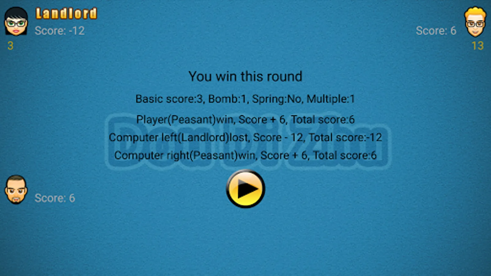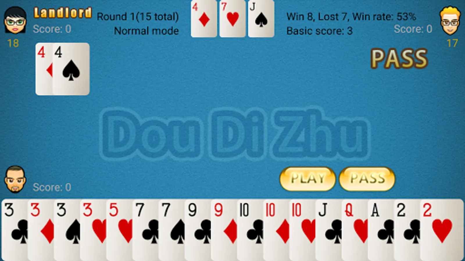 Dou Di Zhu is a poker game for three players. One player, the "landlord", plays alone and the others form a team. The landlord's aim is to be the first to play out all his cards in valid combinations, and the team wins if any one of them manages to play all their cards before the landlord.