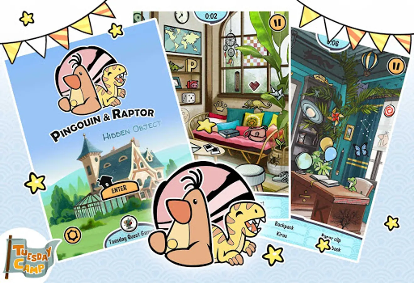 Pingouin’s missing again! Will you be able to find him? One thing is certain: knowing its habits, it’s sleeping somewhere in the manor. Keep your eyes open and help Petit Grou, a cute velociraptor, and Kirou the smart T-rex to find their friend.