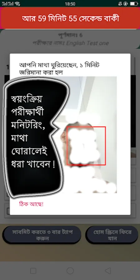 এতে আছে স্বয়ংক্রিয় পরীক্ষার্থী মনিটরিং ব্যবস্থা, যা পরীক্ষায় আপনার ফোনের ফ্রন্ট ক্যামেরা ব্যাবহার করে আপনাকে মনিটরিং করে , যার মাধ্যমে ঘরে বসেই পরীক্ষার হলের পরিবেশ পাবেন।