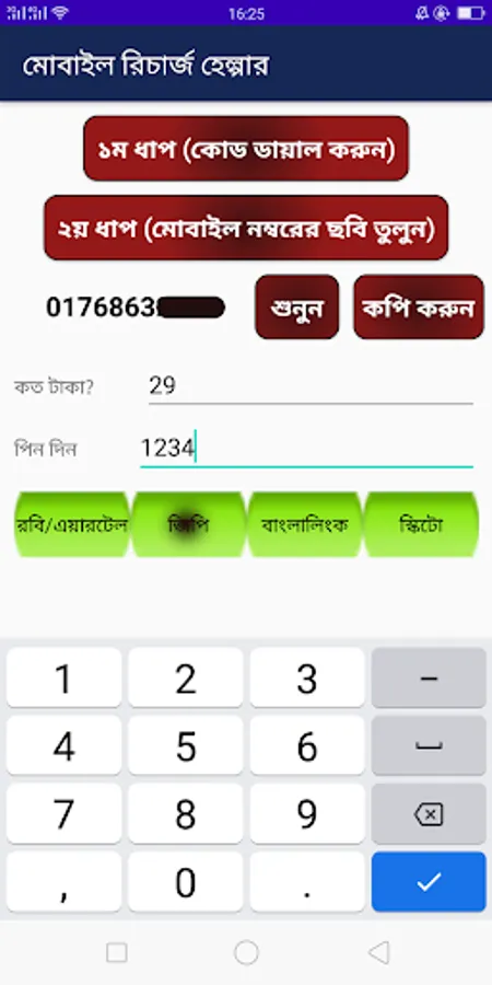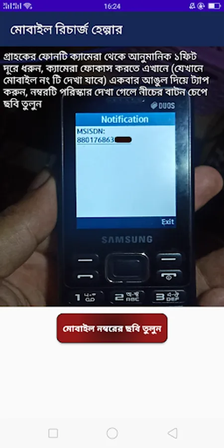 গ্রাহকের মোবাইলে কোড ডায়াল করলে মোবাইল নং দেখা যাবে, তারপর এই অ্যাপসটি দিয়ে ঐ নম্বরের ছবি তুলে রিচার্জ করতে পারবেন,