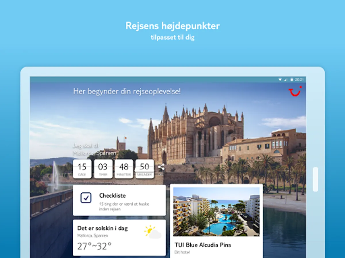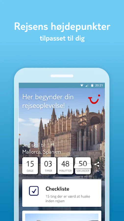 In the app you can follow the countdown to your trip. You can also see the weather forecast for your destination. Here you will also find a travel guide where you can read about sights, beaches, shopping and restaurants at your destination.