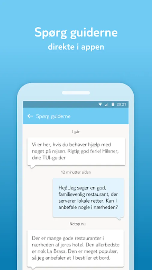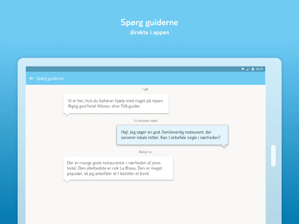 Via the TUI app, you can get in touch with the guides around the clock, every day, during the holidays. You send a message via the Ask the guides in the app and get an answer shortly after. You can also reach the guides via the app in the planning phase - already the day after you have booked the trip. In the app you also get service messages and other important information during the trip.