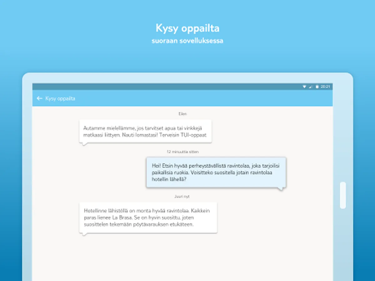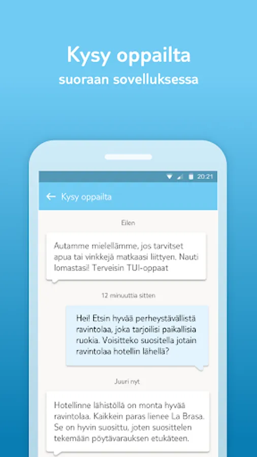 Through the TUI app, you can stay in touch with guides around the clock, any day of the week. You submit your question in the Ask a Guide section of the app and get an answer quickly. And the guides will reach you through the app right at the planning stage - booking your trip the next day. You will also receive messages in the app, both good holiday tips and information about important things during the trip.