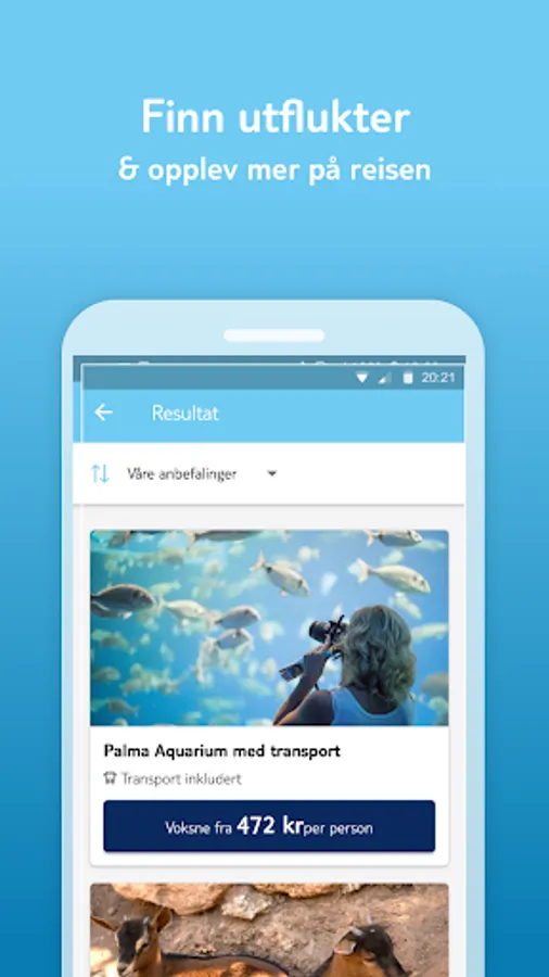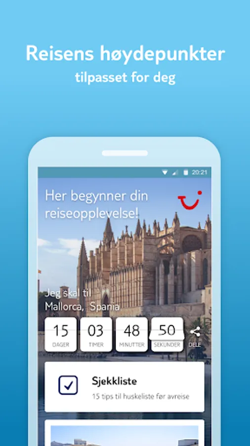 In the app you can follow the countdown to departure. You can also follow the weather forecast for your destination. You can also read about sights, beaches, shopping and restaurants at your destination.