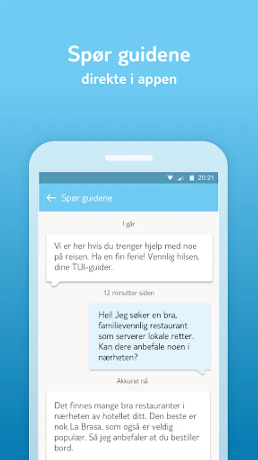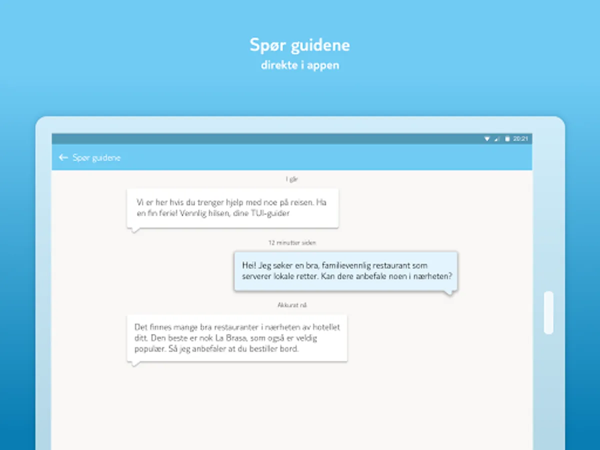 Via the TUI app, you can get in touch with the guides every day, around the clock. You send a message via Ask the guides in the app and get an answer in a short time. You can reach the guides via the app in the planning phase - already the day after the trip has been booked. In the app you also get service information and other important messages during the holiday.