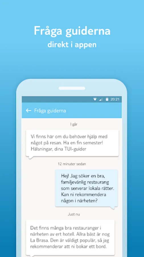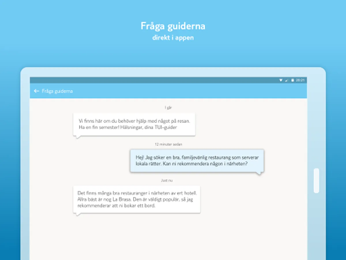 Via the TUI app, you can get in touch with the guides around the clock, every day, every day. You send a message via Ask the guides in the app and get an answer within a short time. And you can reach the guides via the app even in the planning phase - already from the day after you have booked the trip. In the app, you also get service messages and other important information during the trip.