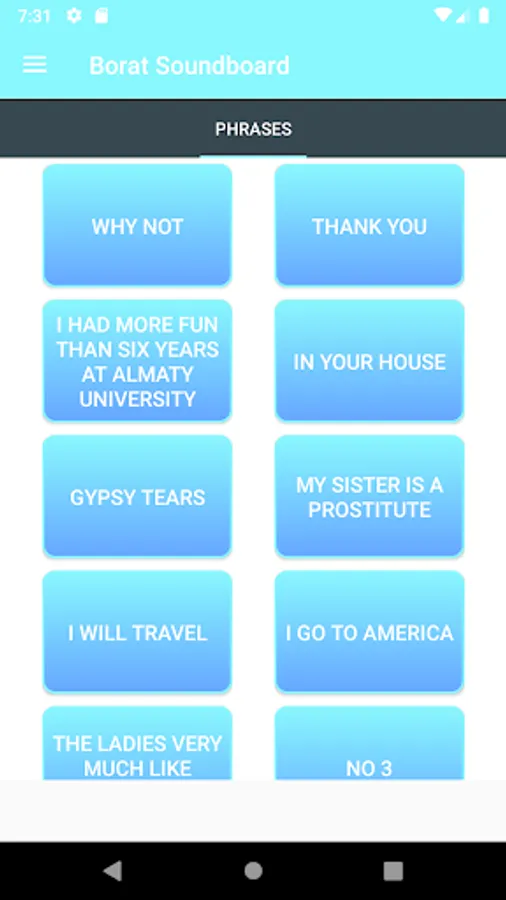 Borat Soundboard contains various sounds, phrases of Borat. This is the best soundboard of Borat!