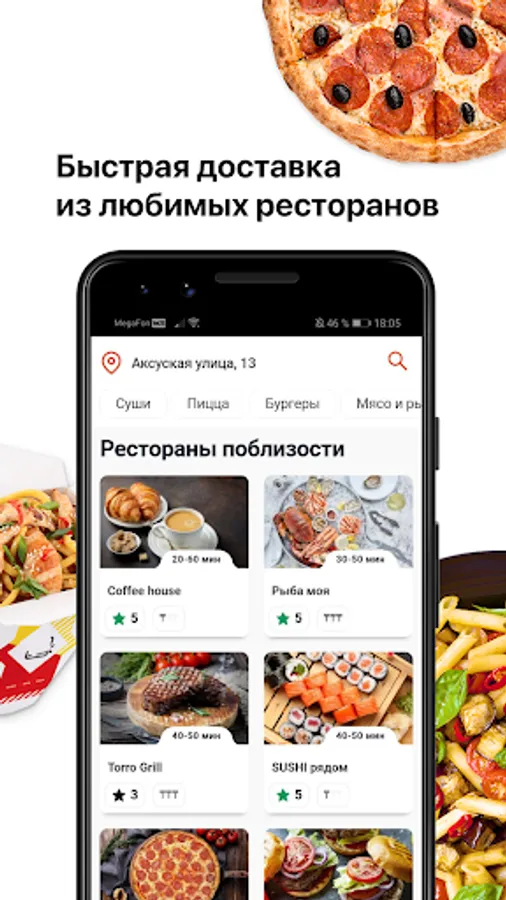 All popular restaurants in the city are now collected in one place. In the application you will find a large selection of goodies: burgers, pizza, doner, chicken, sushi, rolls, ramen, desserts, dishes of Eastern and European cuisine.
