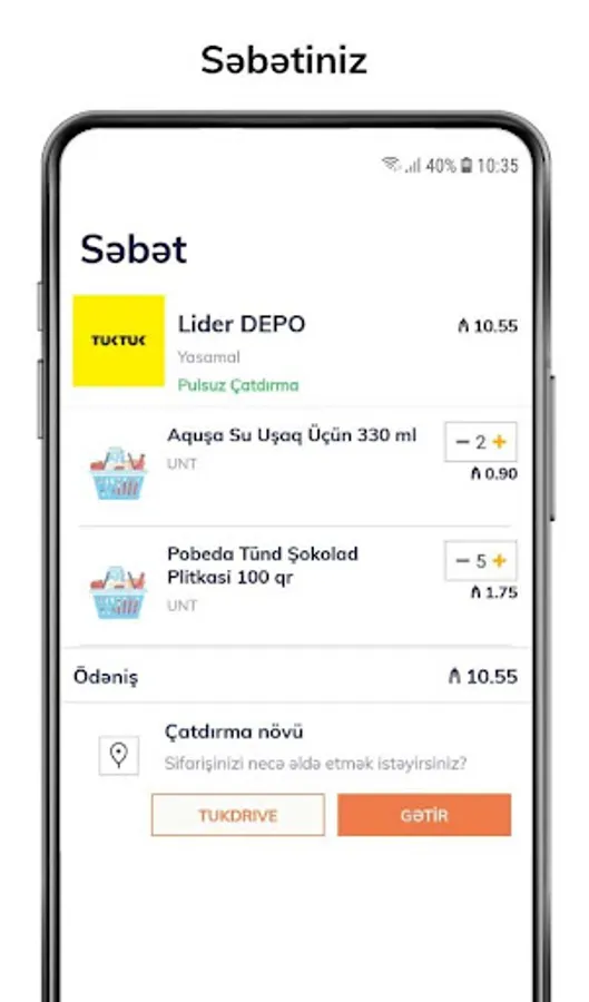 TukTuk application is an online supermarket operating in Azerbaijan. Our wide range of products is as close to you as one click. With TukTuk application we offer you cheap price, 24/7 service and 15 minutes delivery. As a rule, our couriers will deliver your order to your area within 15 minutes, but you can set another time for delivery if you wish. We also take into account the impact of our service on the environment, our couriers will deliver your orders on electric scooters.