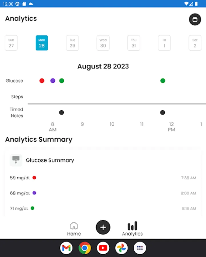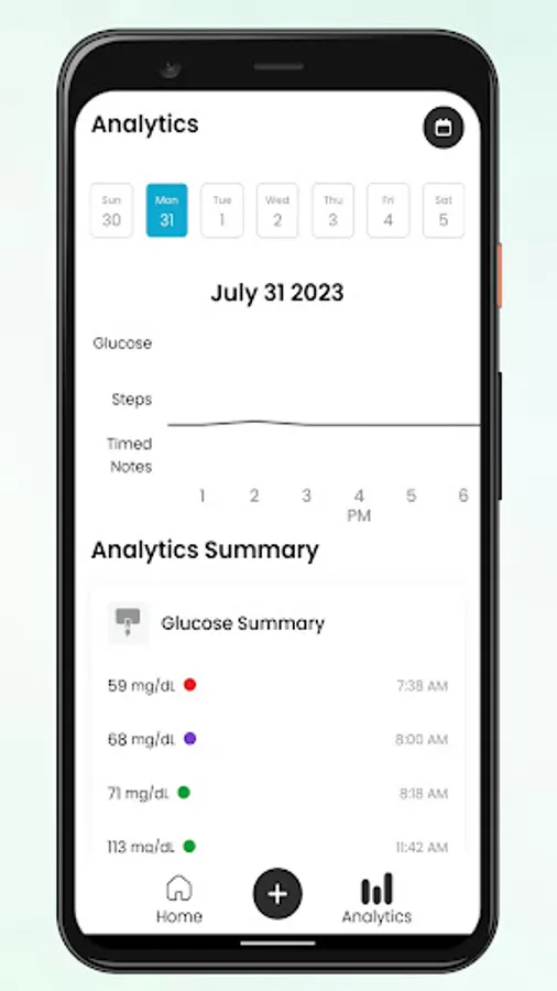 View your health status at a glance. This includes blood sugar trends and averages along with your steps, sleep, and heart rate. You can also create custom goals and targets.