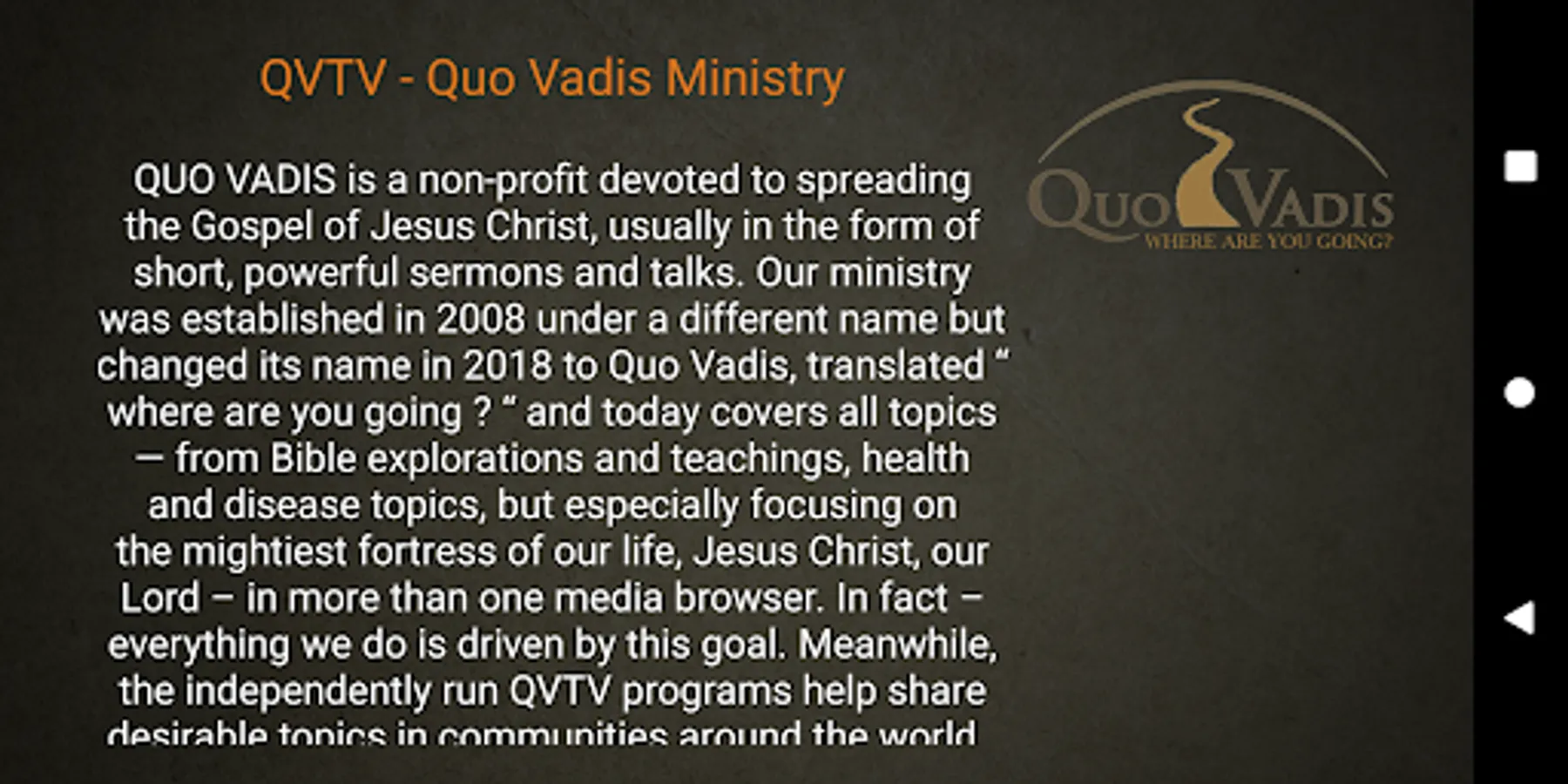 Quo Vadis began in 2008 under a different name but changed its name in 2018 to Quo Vadis, translated “where are you going?” and today covers all topics — from Bible explorations and teachings, health and disease topics, but especially focusing on the mightiest fortress of our life, Jesus Christ, our Lord - in more than one media browser. In fact – everything we do is driven by this goal. Meanwhile, the independently run QVTV programs help share desirable topics in communities around the world.