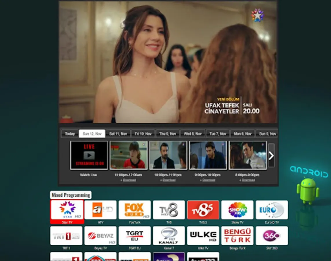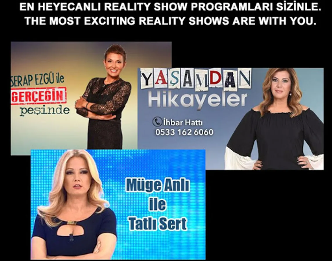 Haber programlarını, dizileri, spor karşılaşmalarını kaçirma derdiniz olmasın. Android TV, mobile/IPTV ve GoogleTV de. Ayrica dünyada ilk kez Roku Market tarafindan onaylanmiş olarak Roku'dan, bilgisayarınızda online, Amazon Fire TV, iPhone/iPad ve AppleTV de seyredebilirsiniz. Her türlü ortamda Türk TV'lerini canlı & kayıtlı olarak İzleyebileceğiniz tek platform.