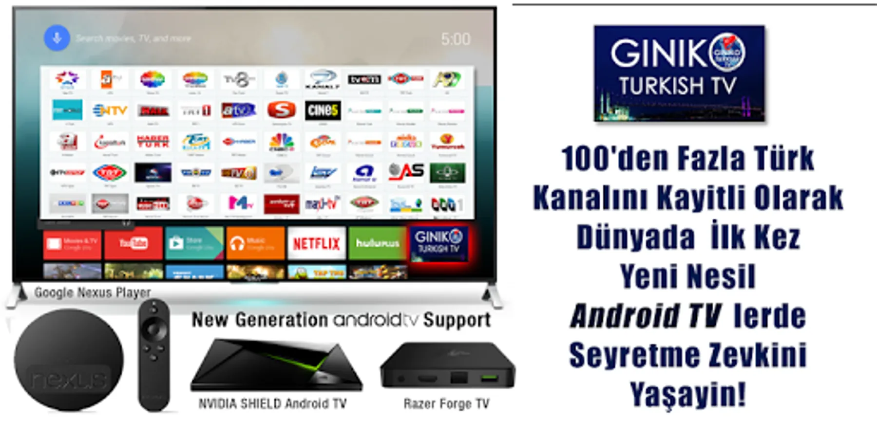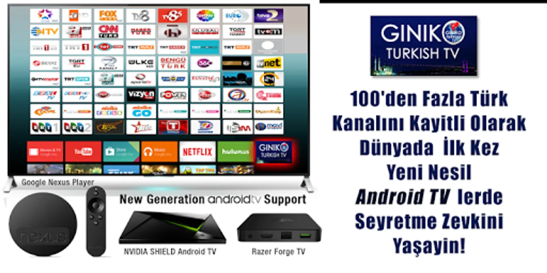 Artik Türk kanallarini yeni nesil Android TV lerde Dünyada ilk kez GinikoTurkish uygulamasini kullanarak seyredebilirsiniz. Üyemiz olun: http://ginikoturkish.com. Sevdiğiniz 100 den Fazla Türk TV Kanallarını Hem Canlı (Live) Hem De 7 Gün Geriye Dönük Olarak HD Kalitesinde yeni nesil Android TV uzerinden televizyonunuzdan izleyin.