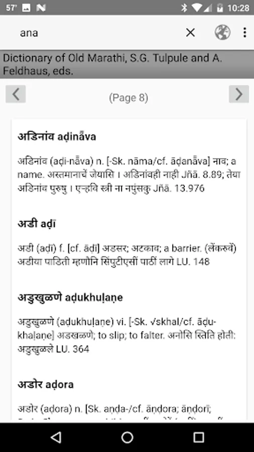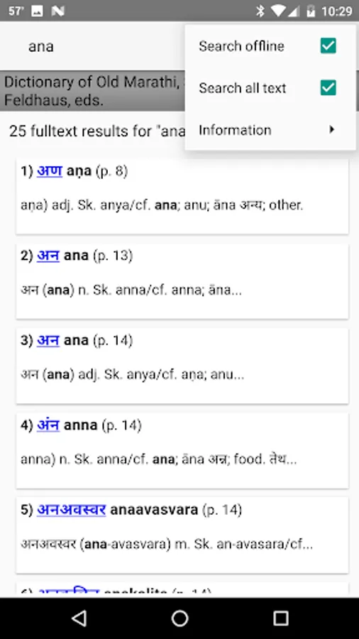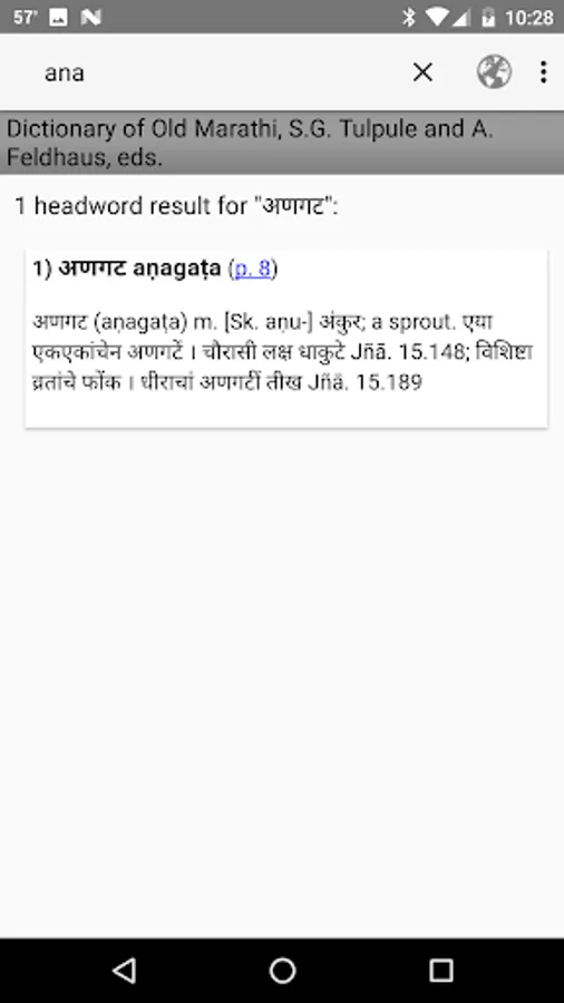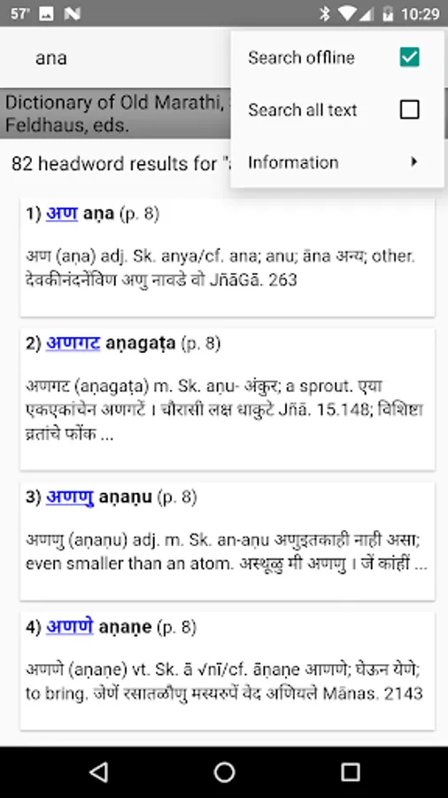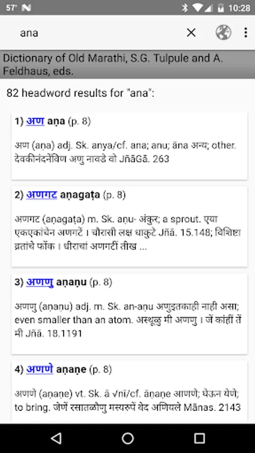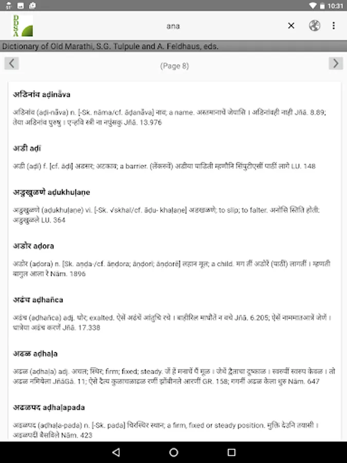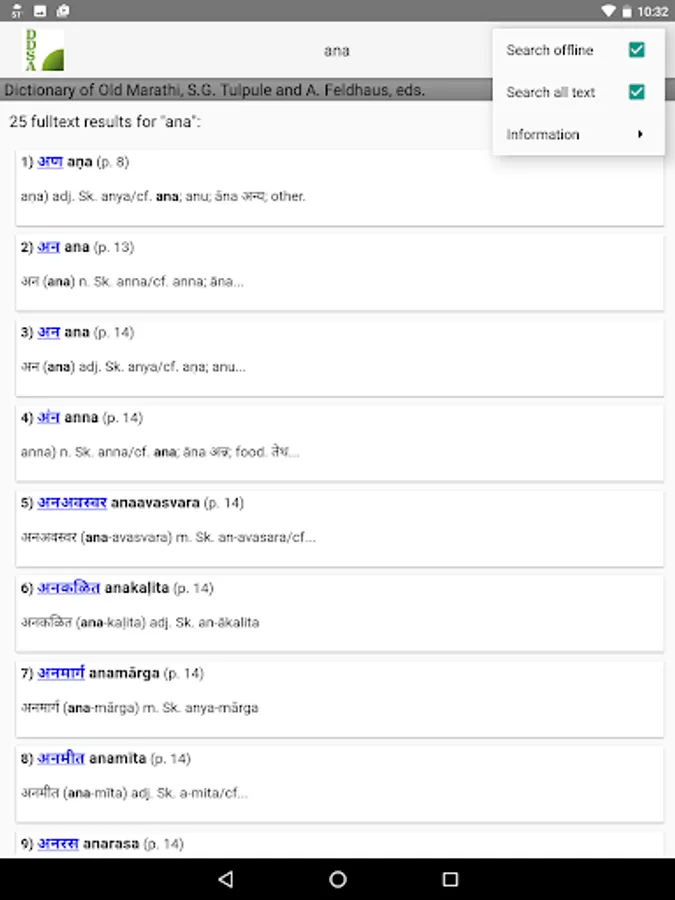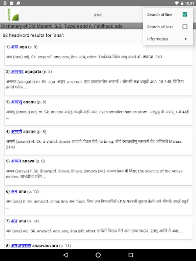 The Old Marathi Dictionary app allows users to conduct both headword and fulltext queries.