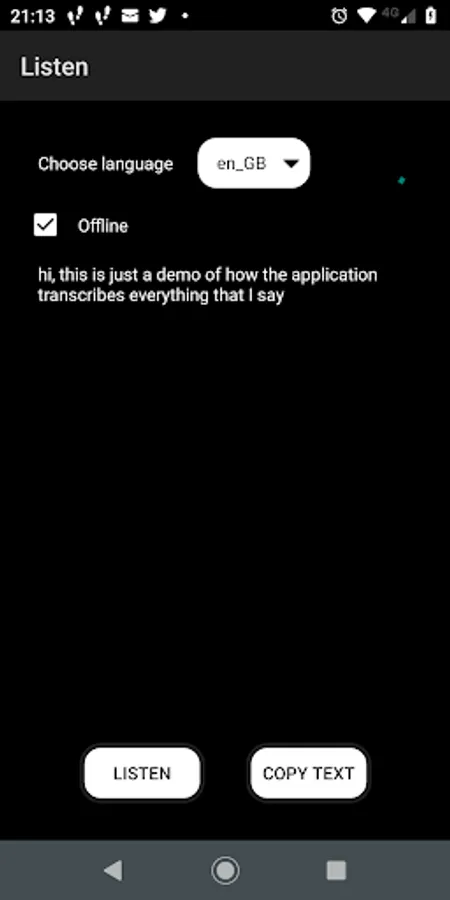 Copy transcribed text to the clipboard with the 'Copy text' button.