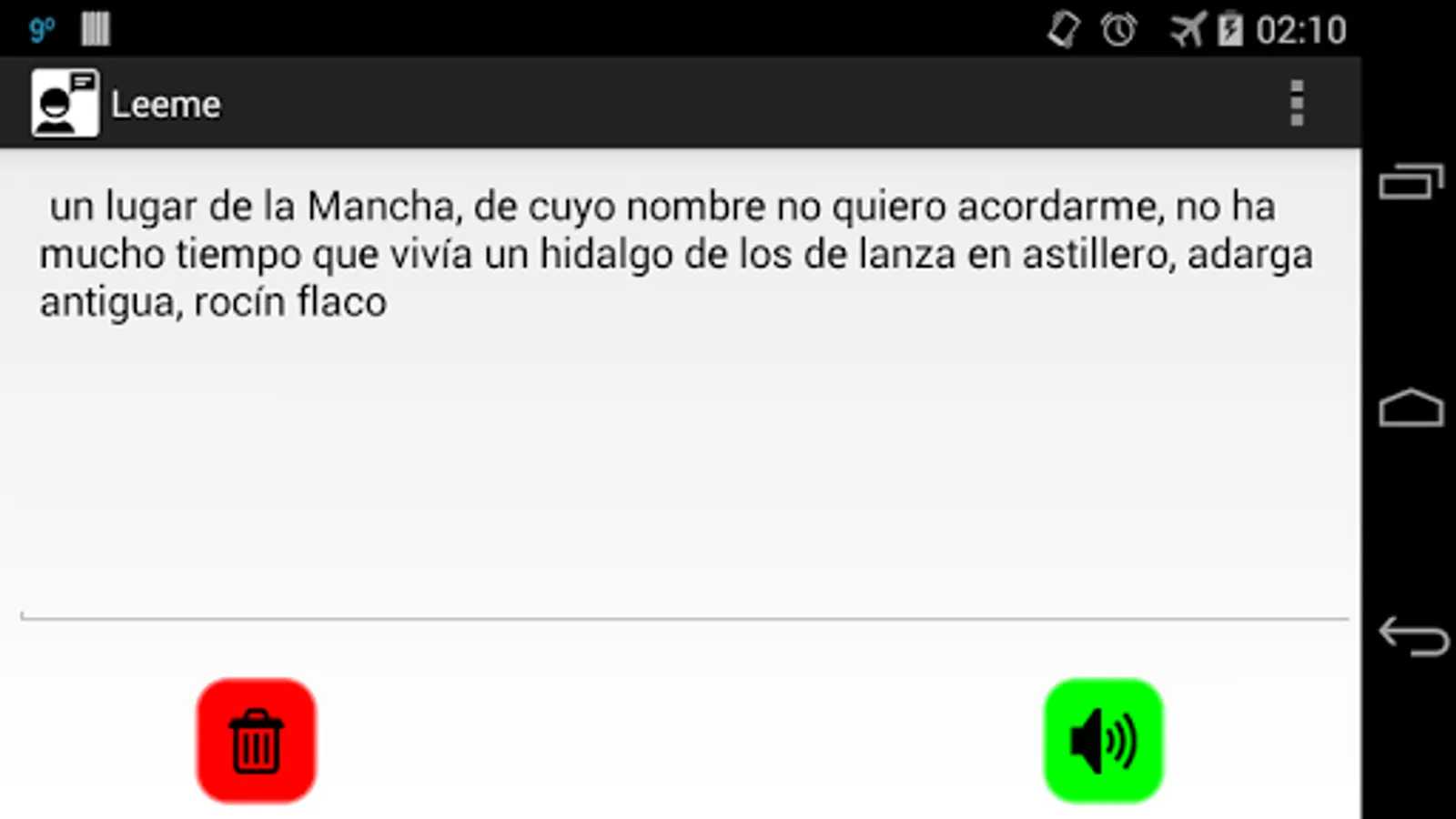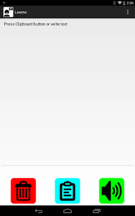 Application to read out written text. The app reads the content of a text box using the default text-to-speech machine configured in the device. The text box can be filled automatically with the content of the clipboard when the app starts.