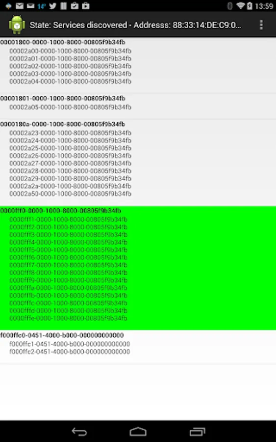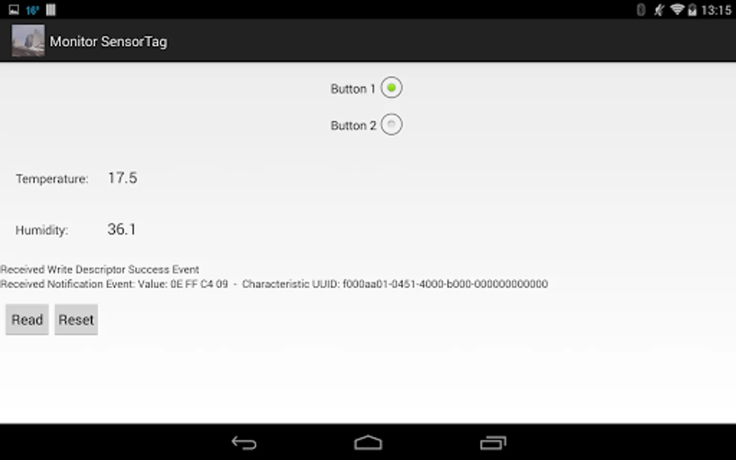 If SensorTag services are found, an activity can be launched to visualise the state of the buttons, ambient temperature (IR Temperature sensor) and humidity from the SensorTag.