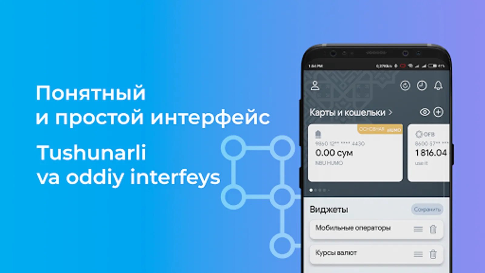 - Information on the cards. View balance on UzCard, HUMO and VISA NBU cards. Reset the incorrect PIN validation inside the Application. Lock / Unlock, the ability to bind and untie the card, and view the synchronization of cards with accounts. Information on NBU transit accounts for crediting funds to an NBU card (20-digit number, MFI, name, address and TIN of the Bank). Search by full name in the section "Cards for transfer".