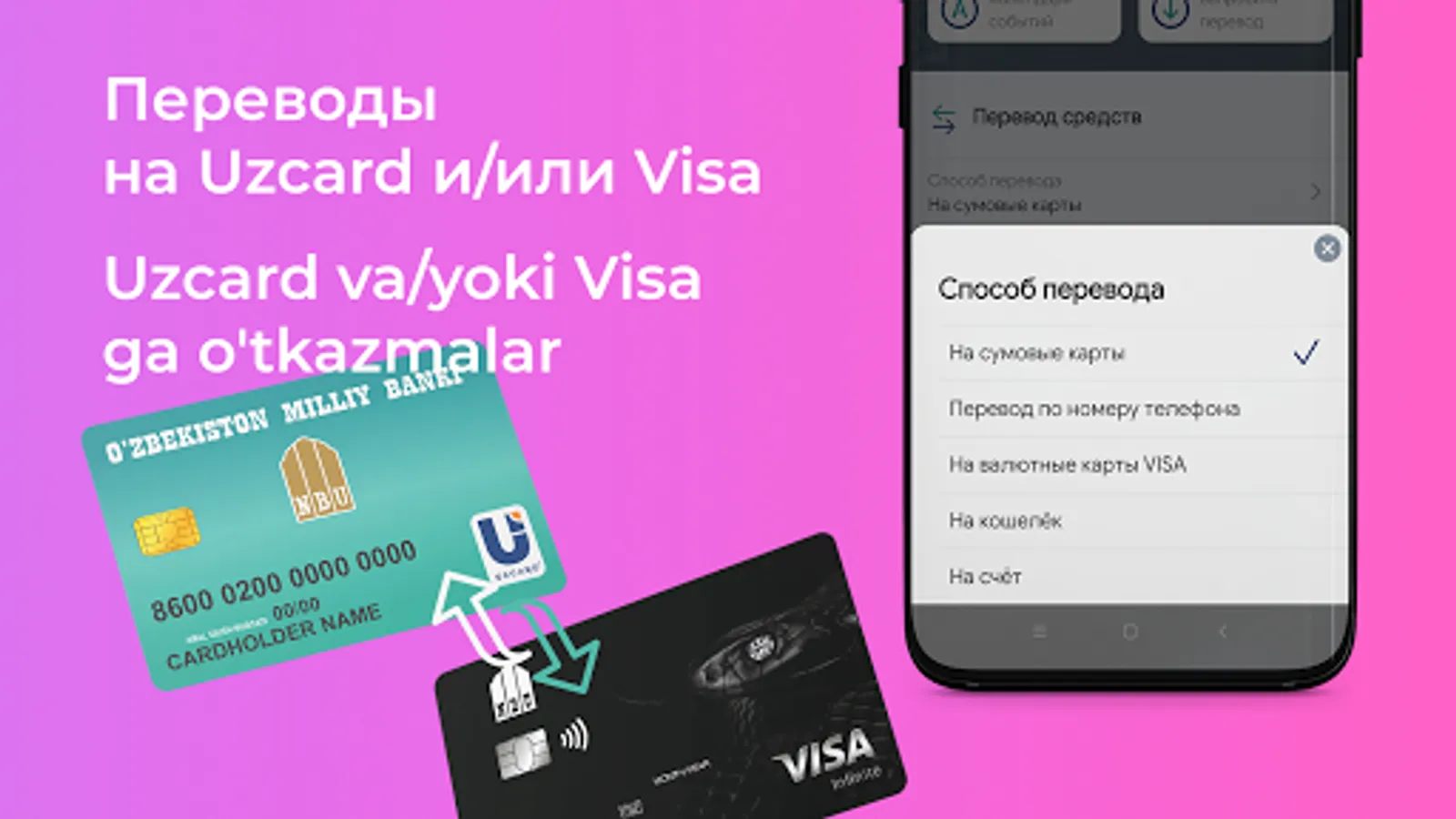 - Function "Express-transfer". The function allows you to transfer funds from one UzCard card to another. The ability to transfer from a card of any Uzbekistan Bank to a NBU card, as well as to cards of other Banks. NFC function allows you to transfer funds contactlessly. Transfer from a card of any Bank to an account opened with NBU with fixed commission of 0.5%.