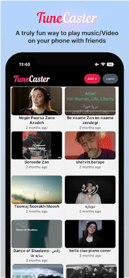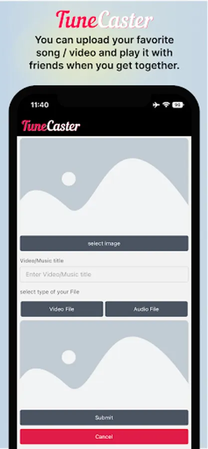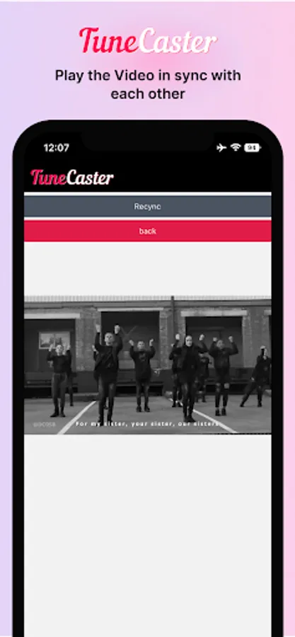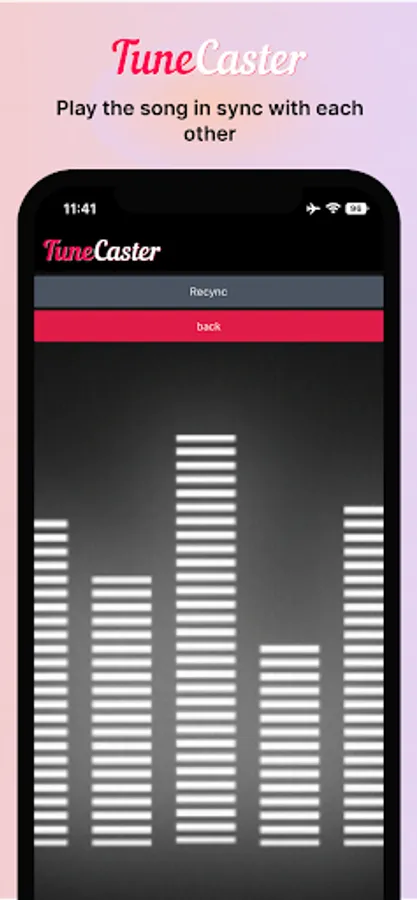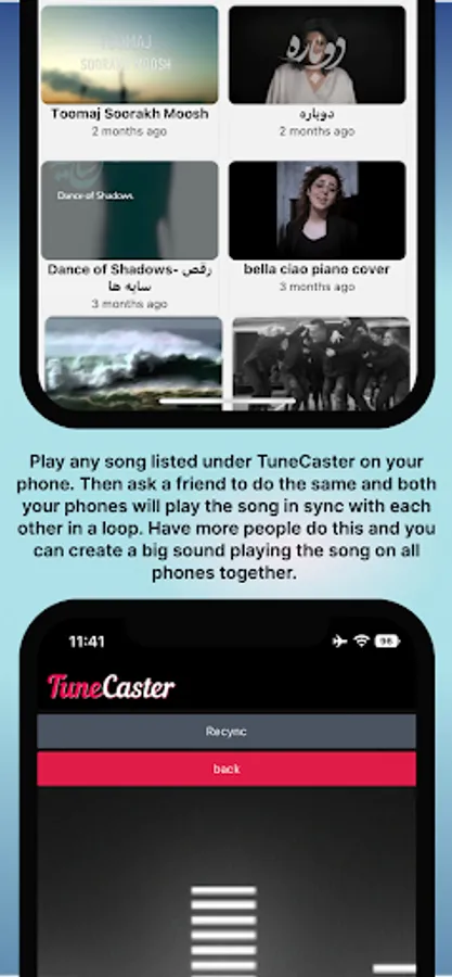 Play any song listed under TuneCaster on your phone. Then ask a friend to do the same and both your phones will play the song in sync with each other in a loop. Have more people do this and you can create a big sound playing the song on all phones together.