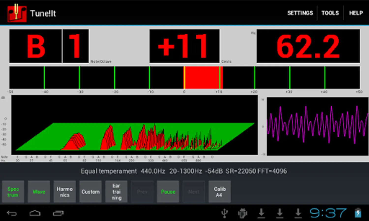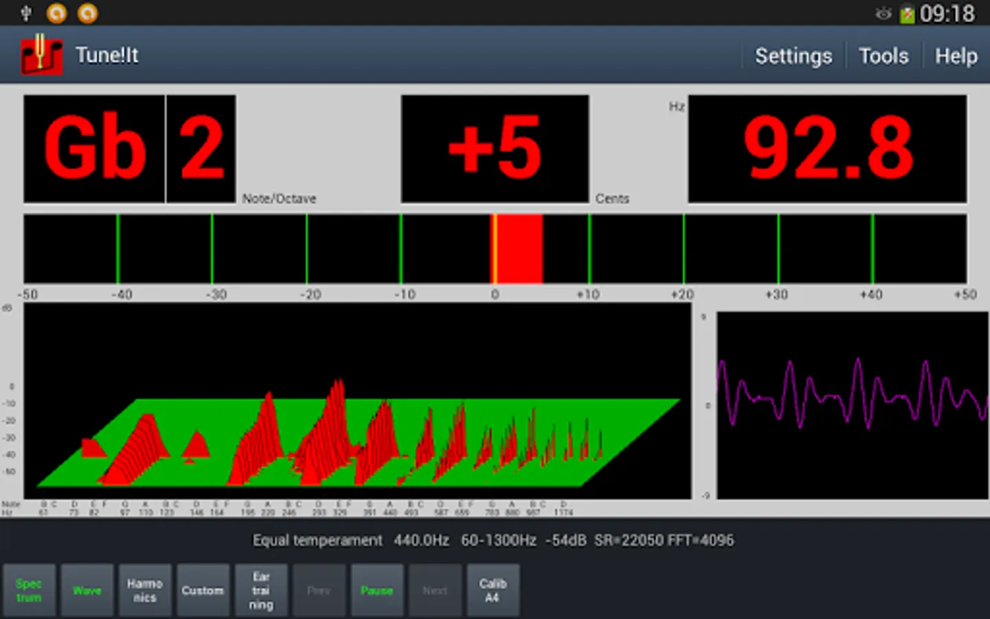- custom tuning to set up special instrument tunings with presets for guitar, violin, viola, cello, bagipe, harp and piano