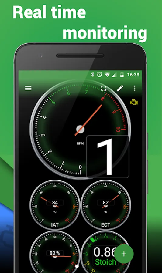 • Real-time parameters: Real time engine and vehicle parameters monitoring (OBD/OBD-II parameters)