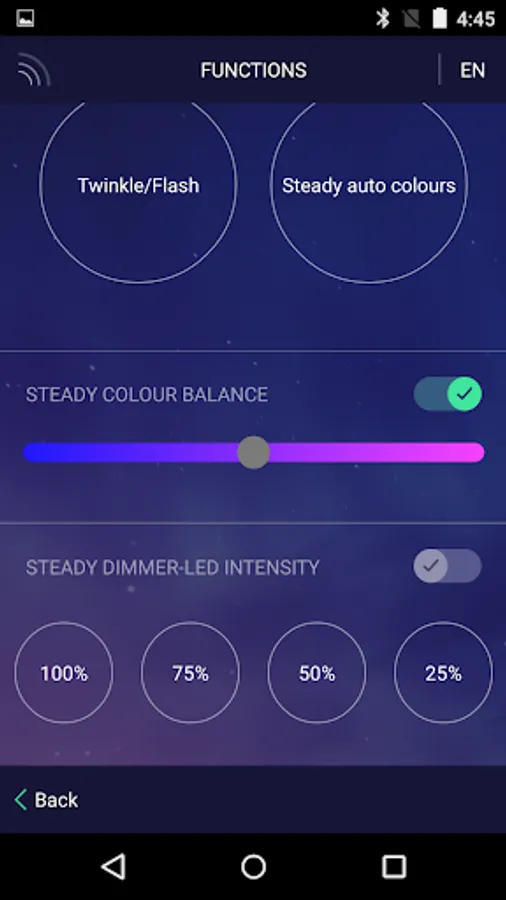 - this App also can self named the light set name depending on your personality and needs on edit interface. - this system have two timer setting function, you can free to set your desired light set operating time. - you can control 1 lighting set or control max. 8 lighting set by checking method to creat control group in one setting. - light control: this App have ON/OFF function, 7 tradional function, and steady auto colours function and STEADY COLOUR BALANCE function and STEADY DIMMER-LED INTENSITY function if you have any question, please can always contact us or feedback at http//:www.cntzdl.com