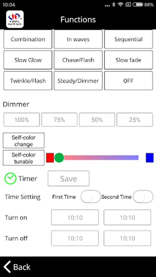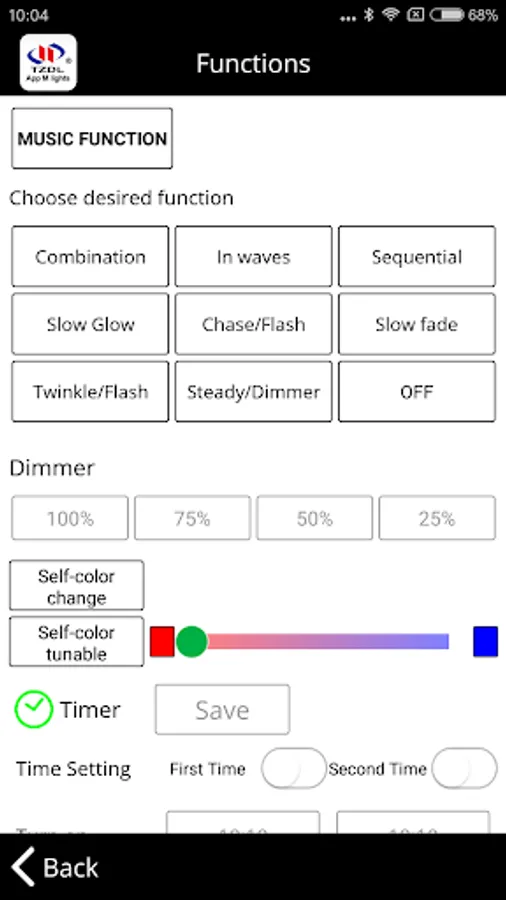 -you can control 1 lighting set or control max. 4 lighting set by checking method to creat control group in one setting. - light control: this App have music function; 9 tradional function; dimmer function; self-color changing, and self-color tunable function. if you have any question, please can always contact us or feedback at http//:www.cntzdl.com