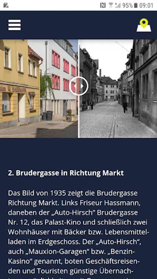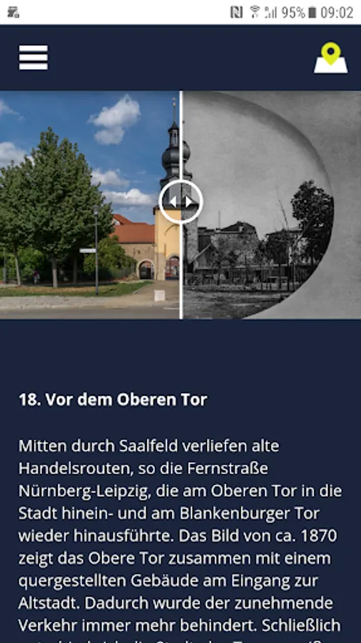 Zeitsprünge Saalfeld - The Multimedia Guide to the Special Exhibition in the Saalfeld City Museum. The guide juxtaposes historical images from the Bildarchiv of the Stadtmuseum with current color images of a professional photographer from the same perspective and invites to a city tour through Saalfeld. More than 20 image pairs show how the city has changed. Industrialization, the consequences of the war, "socialist urban redevelopment" and brisk construction after the fall of the Wall meant that the face of the city had changed dramatically several times over the last 150 years. The museum invites you on a journey through time and makes it possible to draw exciting comparisons between the past and today.