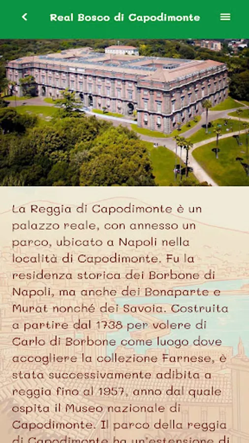 Use GreeNApp to find the green treasures hidden in the city of Naples. Enter the gardens of Naples and with geolocation participate in quizzes and interactive games to reveal curiosities about the city's plant heritage; collect experience points and climb to the top of the special GreeNApp ranking!