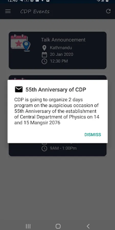 The Central Department of Physics (CDP), Tribhuvan University has been helping to bring the world of Physics education and research to interested Nepalese students since 1969 by offering theoretical Physics course in the Master's level. We aim to connect every students from CDP with help of this app.