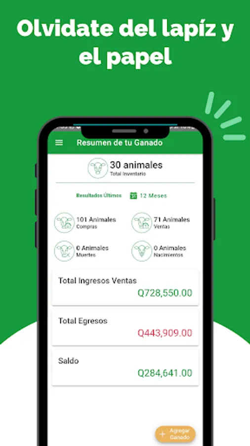 No longer keep track of your cattle by hand. In the Tu Potrero app you can keep track of your cattle inventory, purchases, sales, births, losses, income and expenses easily and all on your cell phone.