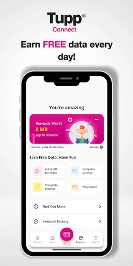Free Daily Data: Earn data by viewing ads, surveys, or playing games in-app.