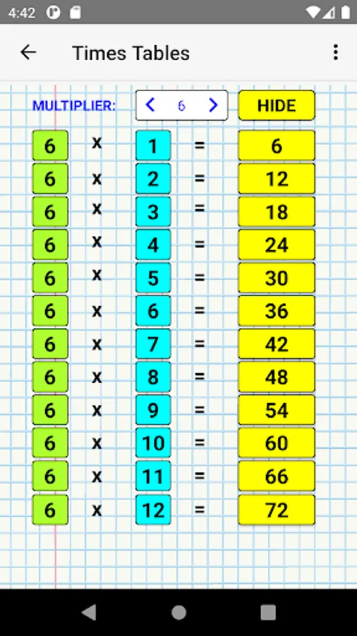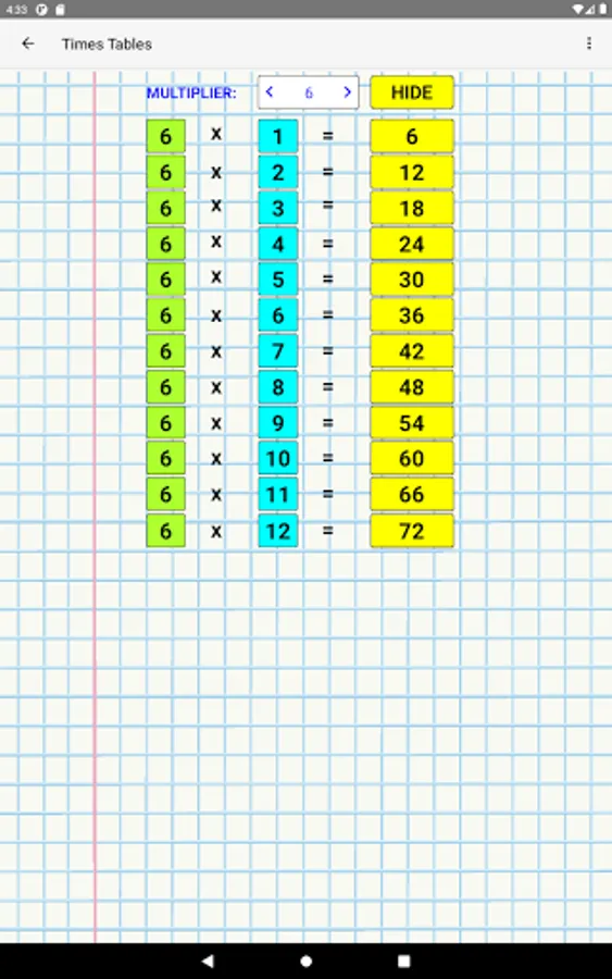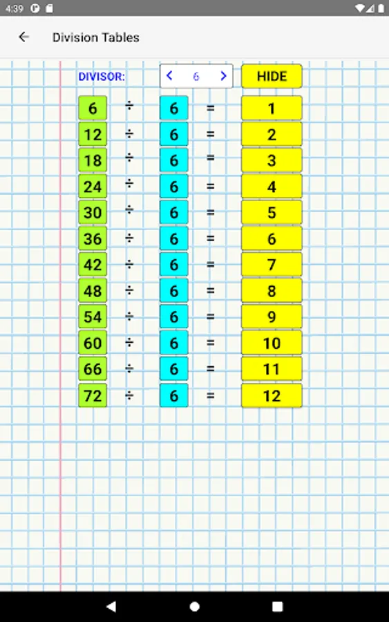 arg1 ® arg2 = [ ? ] Pressing [ ? ] reveals the answer. Multiple choices are not needed nor is the phone keyboard required for entries. Just mental math. Since questions are randomly generated, every practice session is unique.