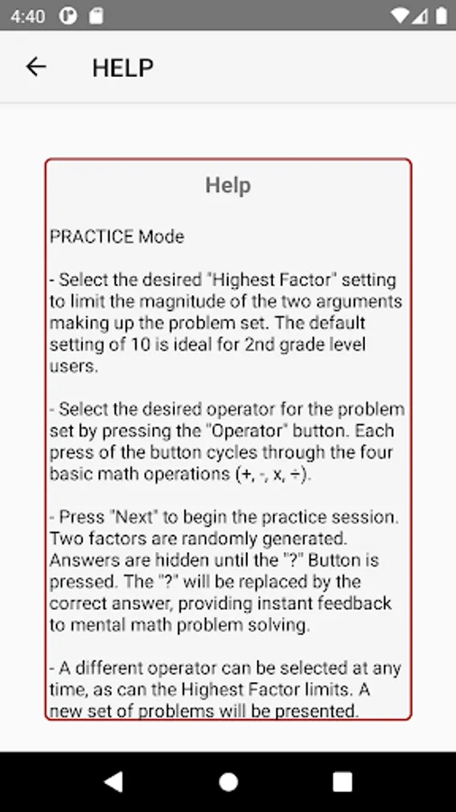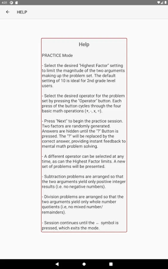 - PRACTICE Mode. Basic integer addition, subtraction, multiplication and division. Answers are always positive integers, thus no remainders or negative numbers are possible. The upper number limit is selectable.