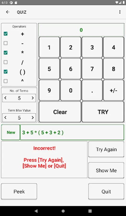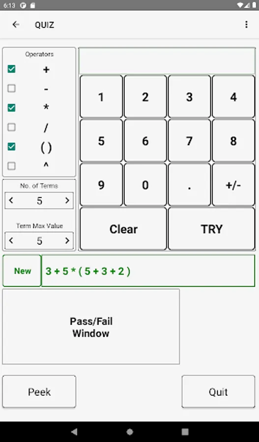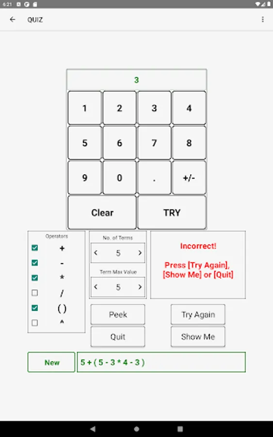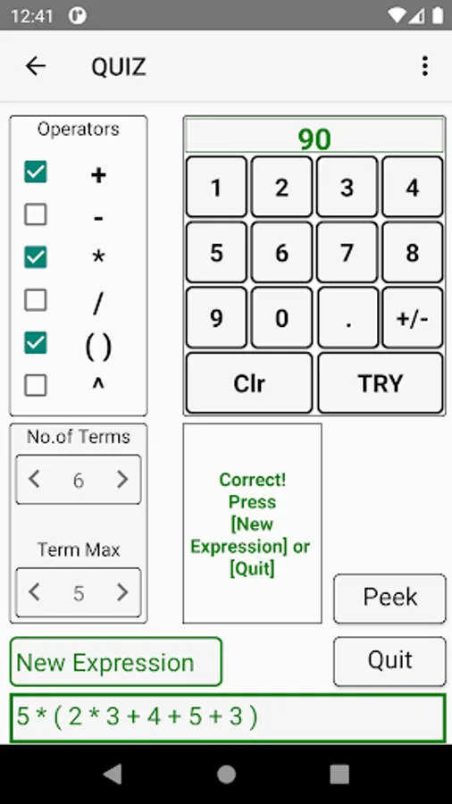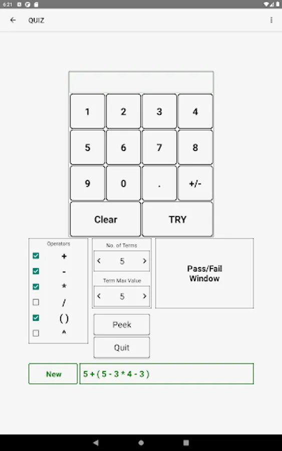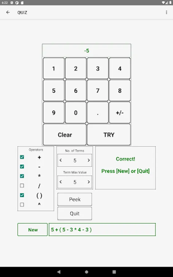 In the QUIZ mode, between two and ten variables can be selected, their maximum value and which operators that are eligible. The program then randomly generates an algebraic expression using these parameters.