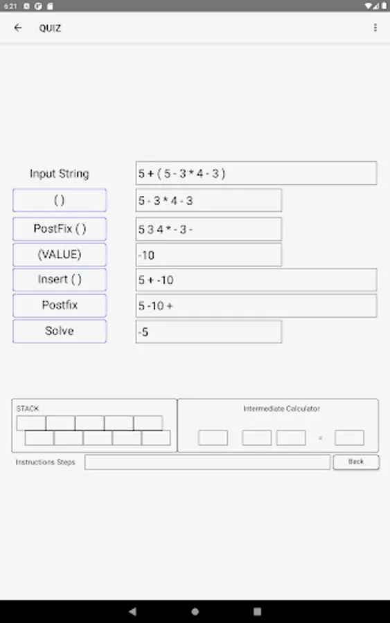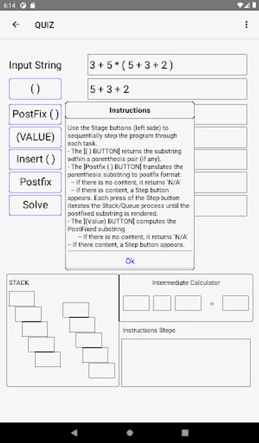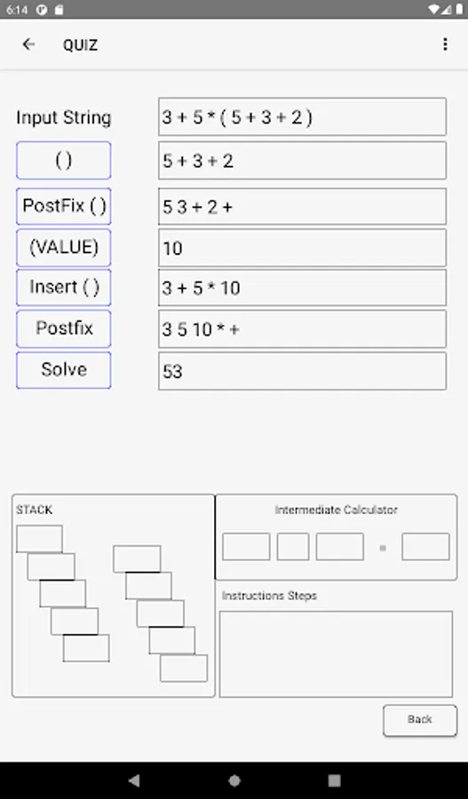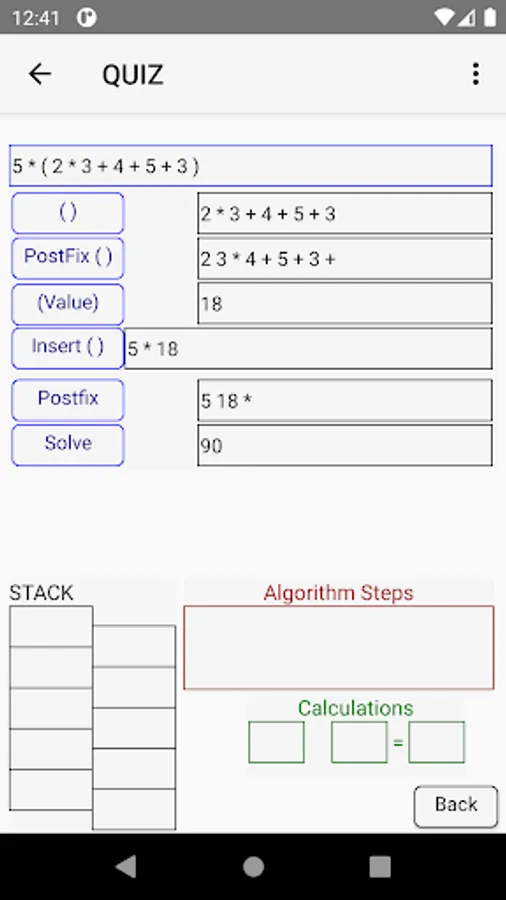 We’re going to take a closer look under the hood at Order of Operations algorithms. It will interest programmers and school students alike; for programmers, the use of queues and stacks will reinforce previous computer science learning; for students, it allows them to write an expression, then analyze it using Order of Operations rules, step by step. The Quiz mode generates random expressions of user selected lengths and magnitudes and checks the student's answer. Incorrect answers can be examined using the same step by step process.