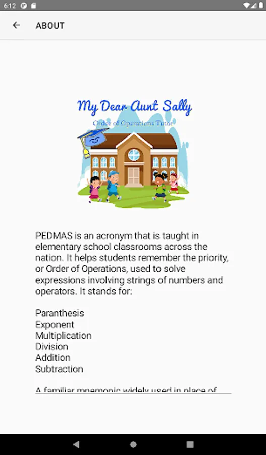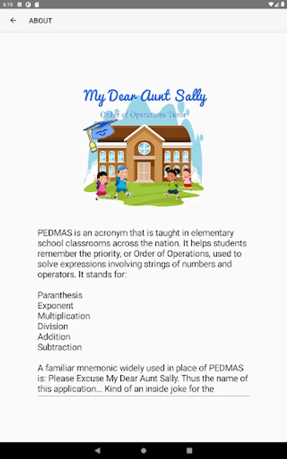 A familiar mnemonic widely used in place of PEDMAS is: Please Excuse My Dear Aunt Sally. Thus the name of this application... Kind of an inside joke for the mathematical types.