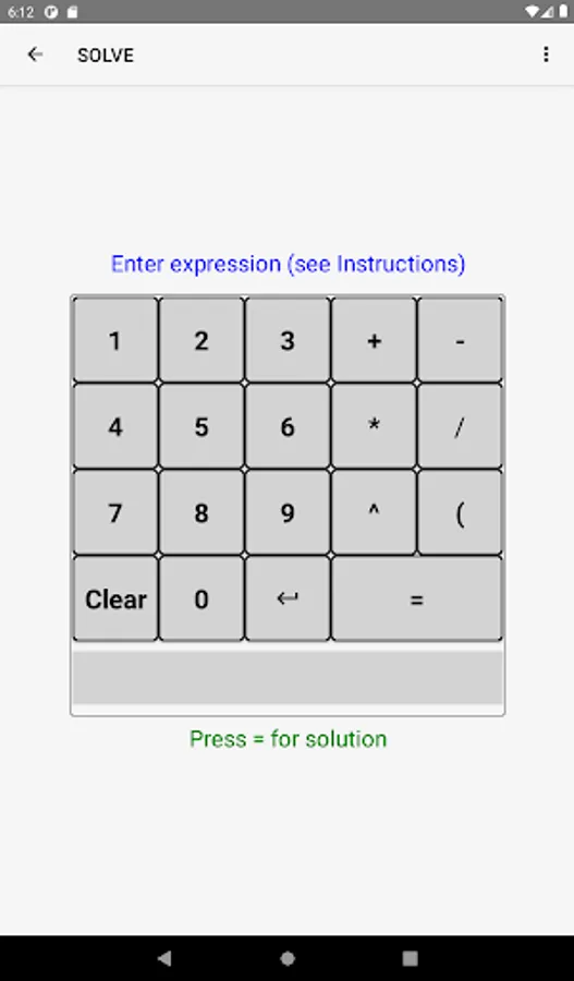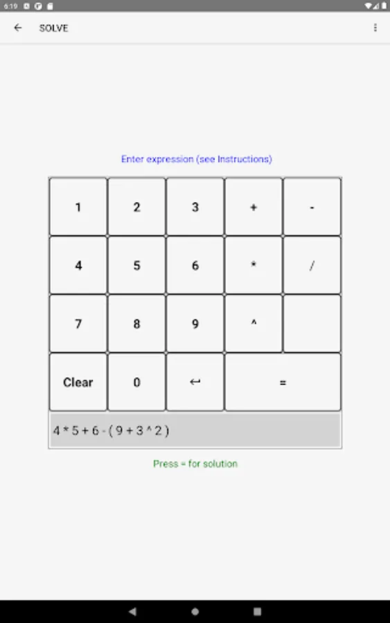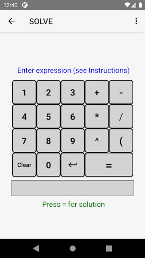 In the SOLVE mode, algebraic expressions are entered free hand using an internal keyboard which limits entries to the five common mathematical operators (+ - / * ^) as well as one level of parenthesis. There is a maximum term limit of ten variables, but no limit to their magnitude in this mode.