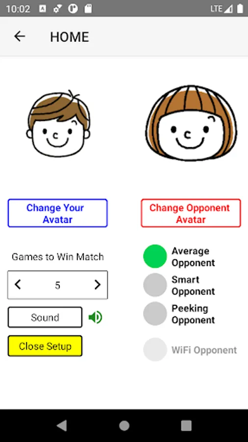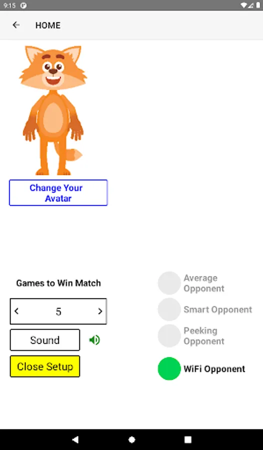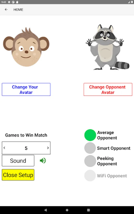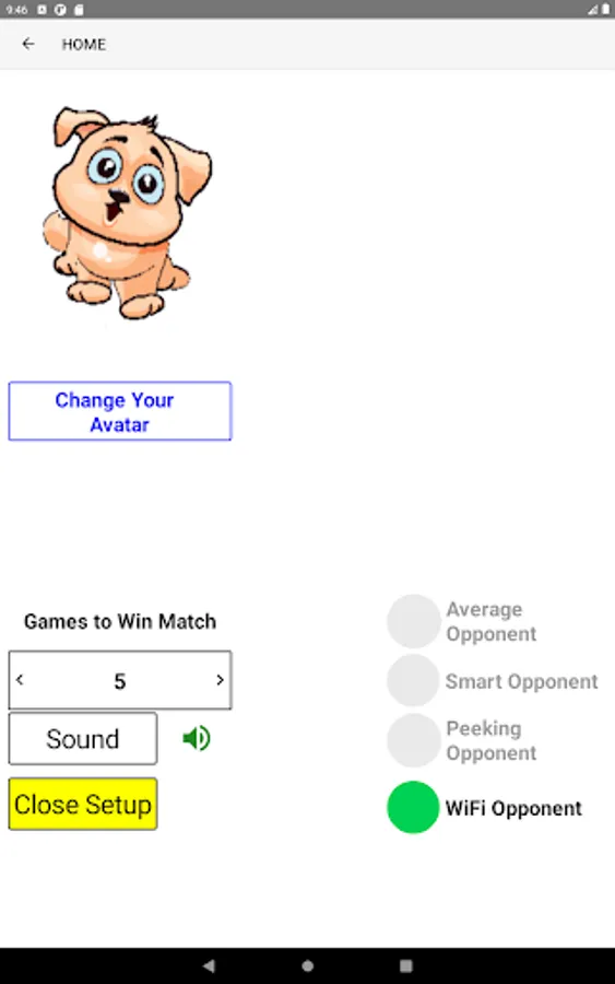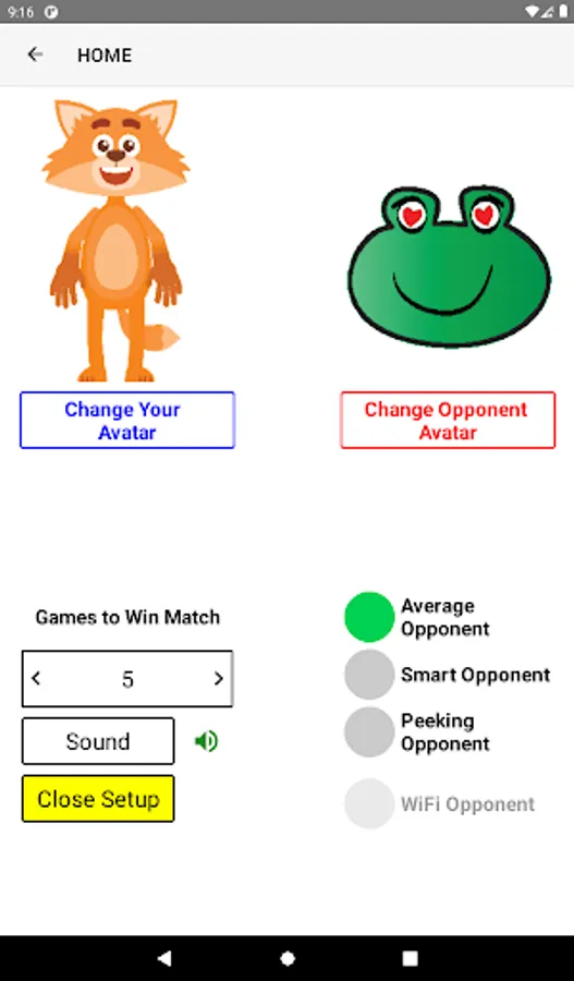 When opened, the program immediately sends you to the WiFi Setup page where you can verify YOUR avatar (or choose a new one), games in a match and sound option. Unlike the Solo Mode, there is only one avatar selection. The opponent will select an avatar on a similar Setup page.