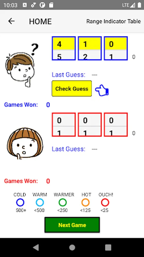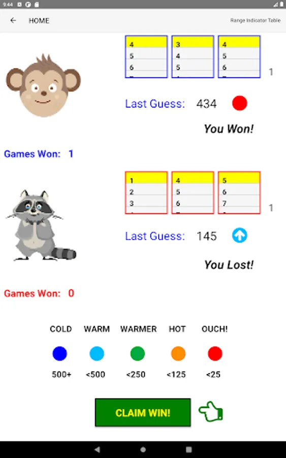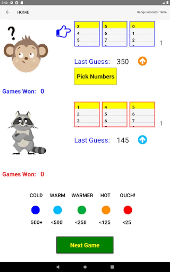 The computer opponent uses its previous guess and Range Indicator independently so as to continually reduce the range of its next random number guess.