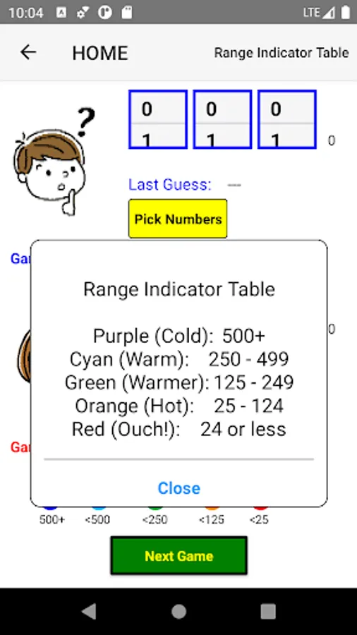 Pressing "CHECK GUESS" causes the program to evaluate the guess. If there is no match, a Miss Distance Indicator is displayed.