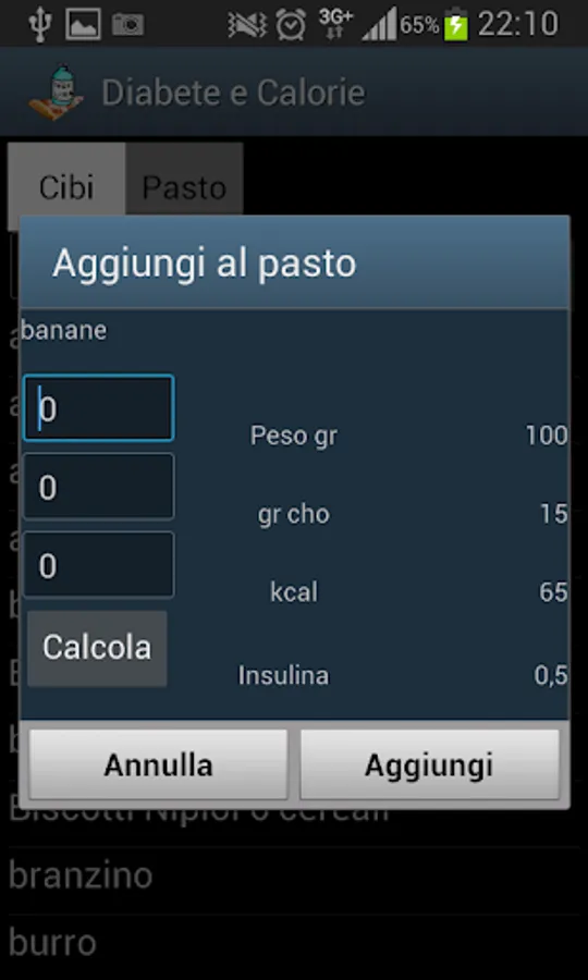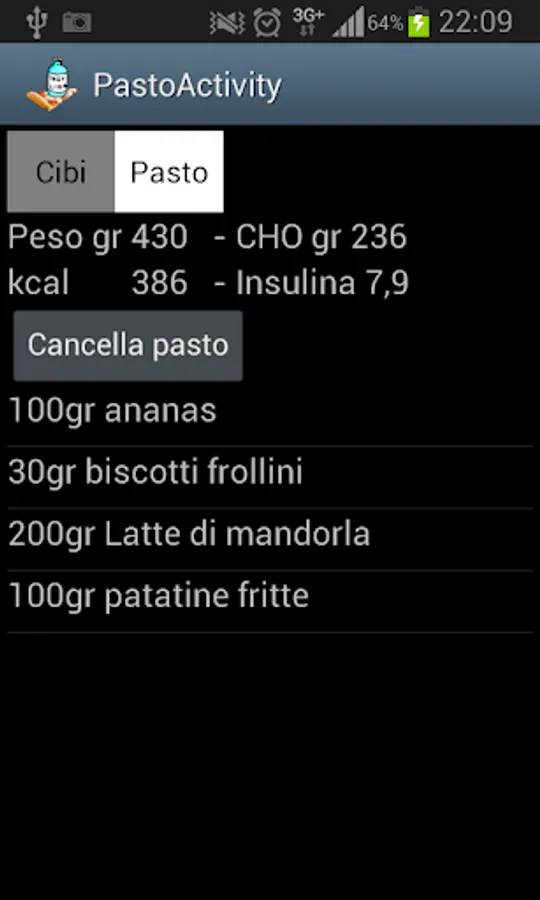 Starting from table foods you can compose a meal obtaining data useful for diabetics and those who want to control weight, displays CHO (carbohydrate), calories and insulin. It helps control the diet.