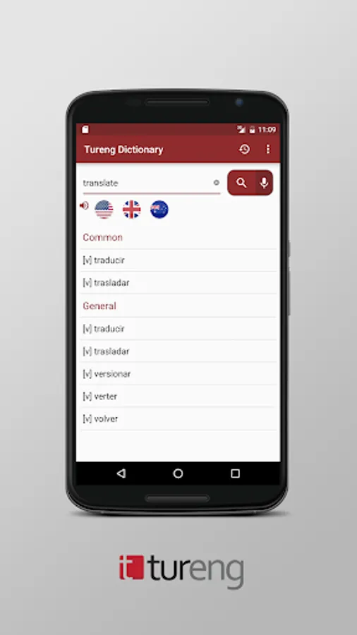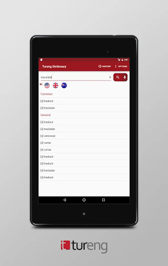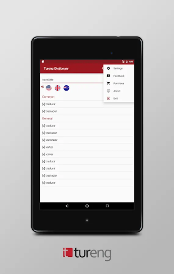 Having more than 3.000.000 English and Spanish words and phrases, classified into categories by the field of their usage, Tureng Dictionary, aiming to give the most accurate result in the fastest way, now provides the users with audial pronunciation option to hear the terms searched in the dictionary in two accents in Spanish (Spain Spanish and Mexican Spanish) and three different English accents, British, American and Australian.