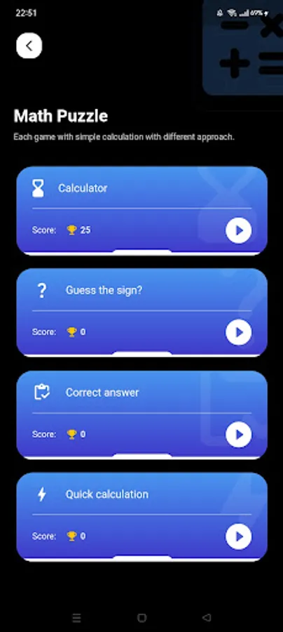 1) Matematik Bulmacası: Toplama, çıkarma, bölme ve çarpma gibi temel hesaplamalara odaklanır. Eğlenirken sayısal becerilerinizi test edin ve matematiksel yeterliliğinizi geliştirin.