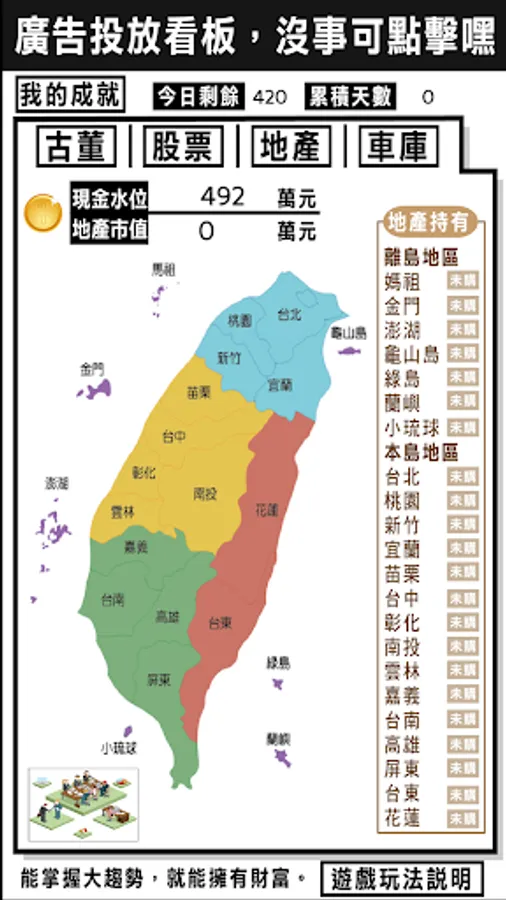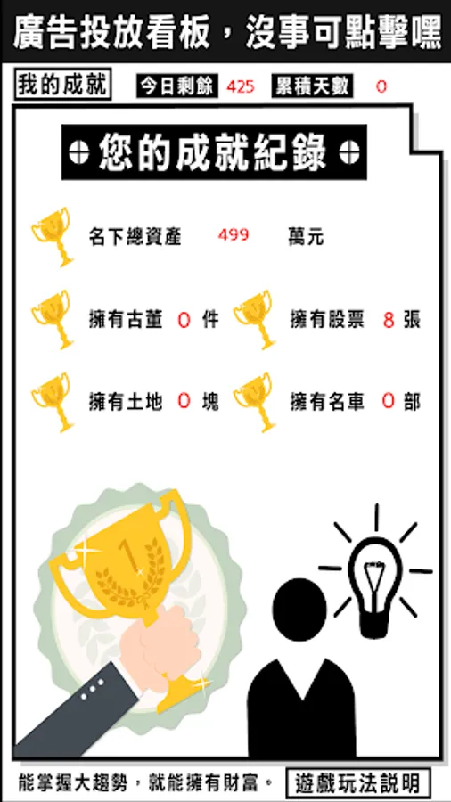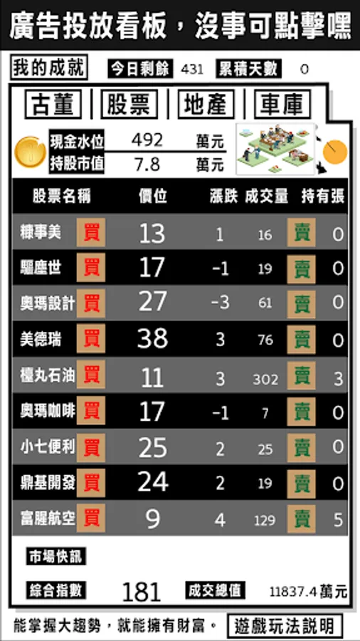 簡單版的迷你股市遊戲,許多功能尚在測試及修改中,之前曾經發佈過,現在重新封裝後上架,還是免費遊戲~