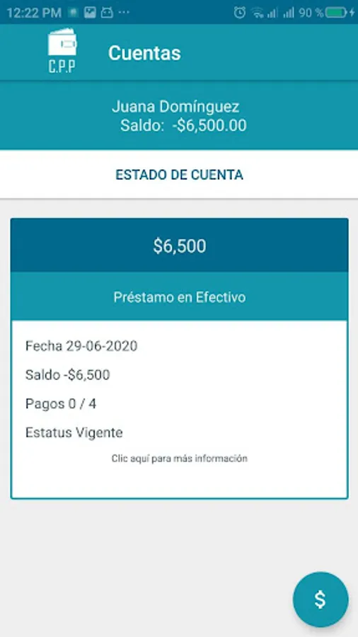 • The customer payment registration form. Reports the current debt of the borrower and the distribution of this in amount of default, interest and amortization.
